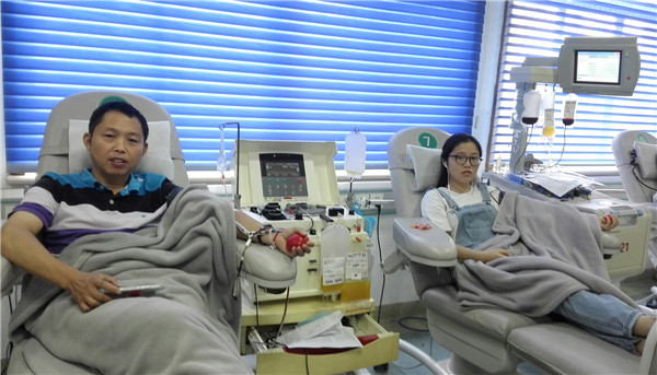8月27日上午,中心资深无偿献血者周奇带着刚满十八周岁的女儿周雨婷来到了机采室,他们要一起捐献机采血小板。这已是周奇第40次捐献血小板了。十几年前,周奇一直定期捐献全血,当他了解到与献全血相比,捐献血小板可以节约更多的血液资源,而且健康人体内血小板数量充裕,捐出的血小板在48—72小时之间就可以恢复到采前水平;血小板可以挽救止血困难的病人,他毅然决定开始捐献机采血小板并一直坚持至今。据统计,从2001年4月开始,周奇共捐献了3300ML全血,43个治疗量血小板。