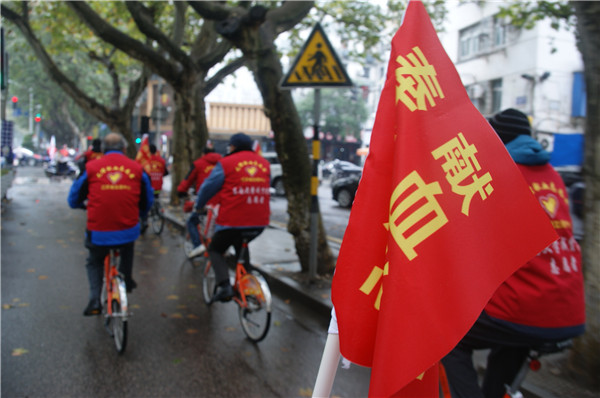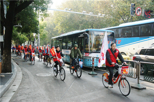 11月26日上午9点,江苏省志愿者无偿献血宣传服务队“血&缘”骑行分队正式组建。一群有爱心的志愿者们在鼓楼广场的献血车旁整装待发,他们穿着红马甲,租借公共自行车,带着印有无偿献血标语的小旗子,按照所分配的线路,绕南京城骑行。本次骑行途径中心的鼓楼、大洋百货、夫子庙、大行宫四个献血点,骑行队伍每到一个献血点,志愿者们都会停下步伐,做志愿宣传服务1小时,然后再向下一个献血点出发。此次活动,一方面能沿路推广宣传无偿献血公益事业;另一方面以这种特殊的方式在南京城各个献血点做服务,体现对献血者的感恩之情,体现出与献血者心连心,一路同行的意义。